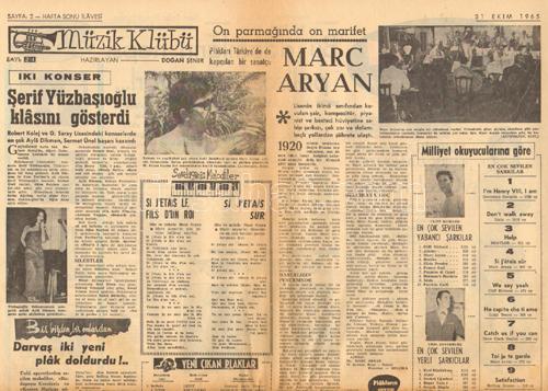MİLLİYET müzik klübü GAZETE 31 EKİM 1965 MARC ARYAN ŞERİF YÜZBAŞIOĞLU ORK.