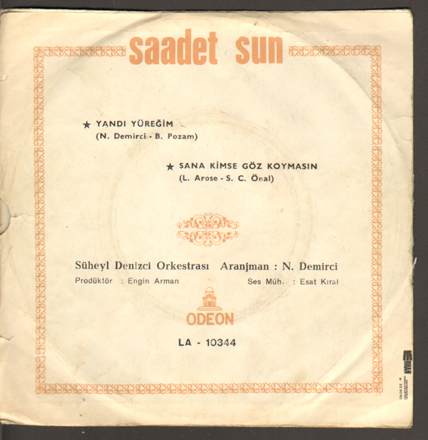 SAADET SUN yandı yüreğim 45 LİK 1970 05/11/2014 admin yerli Pop 45s Leave a comment FİYAT-şu anda yok FİRMA-ODEON A-YANDI YÜREĞİM B-SANA KİMSE GÖZ KOYMASIN KAPAK-8 PLAK -8