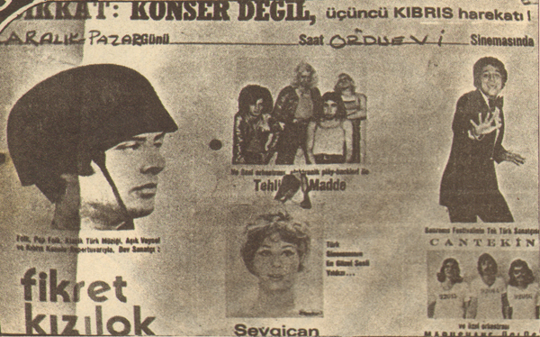 Kıbrıs Harekatının başladığı günler.Tüm gündem Kıbrıs a kilitlenmiş.Militarizm plak piyasasına iyice hükmediyor.Kıbrıs konulu son derece sert şarkılar birbiri ardına piyasaya çıkmakta.Her zaman muhalif tavrı ile bilinen Fikret Kızılok un 1974 yılında Trakya turnesi kapsamında Edirne – Keşan Orduevindeki konserinin afişi..